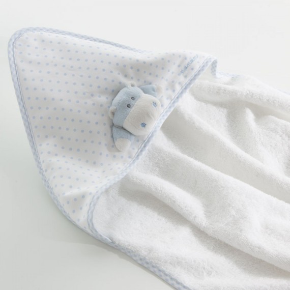 Suave albornoz Nanan de la línea Bombo, adornado con la dulce aplicación del hipopótamo. ¡Conveniente para los baños de los primeros meses de vida!