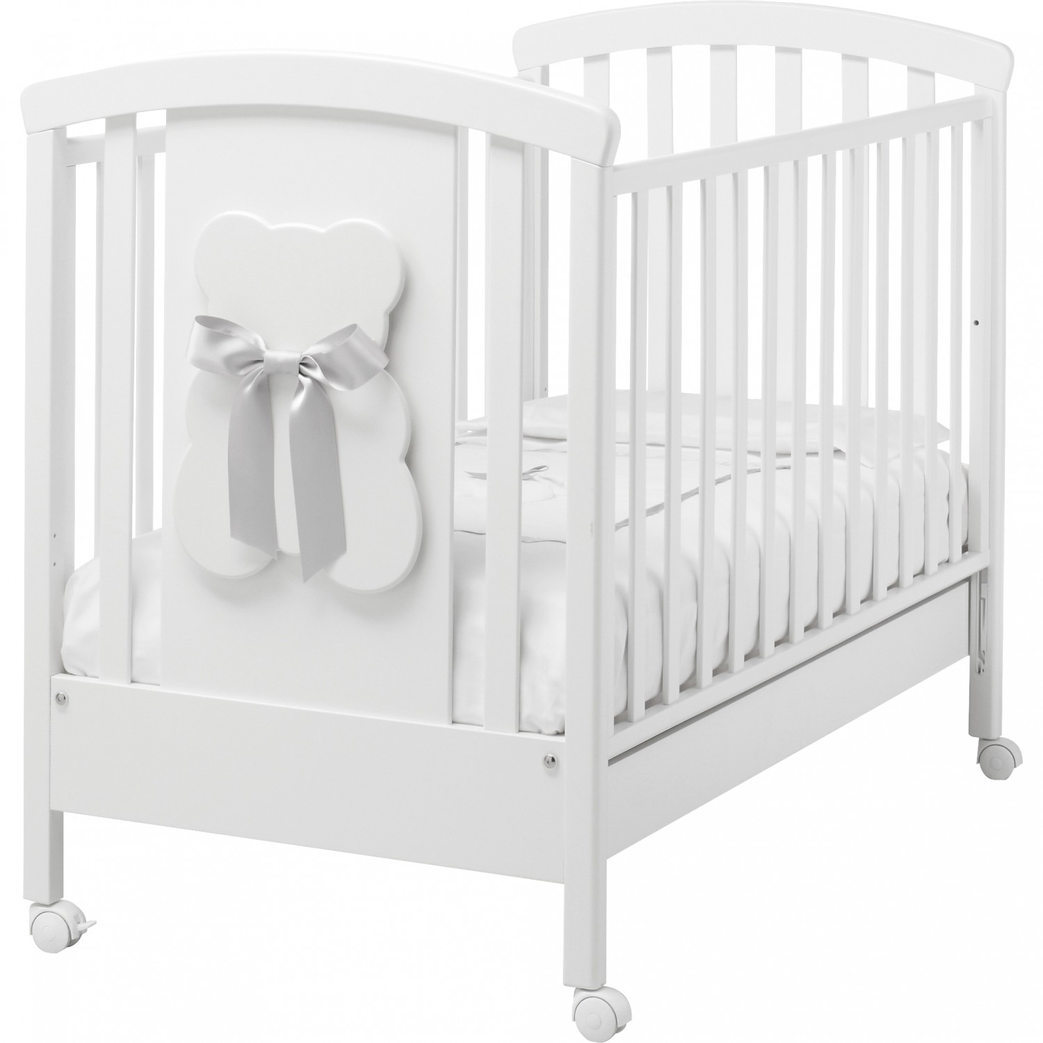 Bubu Cot de Erbesi tiene un oso de madera muy dulce aplicado al pie de cama enriquecido con un elegante lazo.