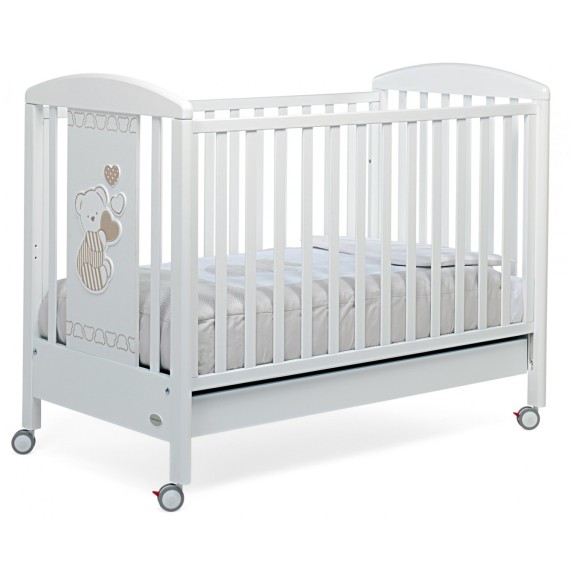 Las decoraciones en relieve tienen un efecto de "tacto suave" gracias al tejido flocado que es agradable al tacto. La cuna tiene un gran cajón inferior, dividido en dos compartimentos, y ruedas de goma antirayaduras, con sistema de frenado, para facilitar el movimiento.