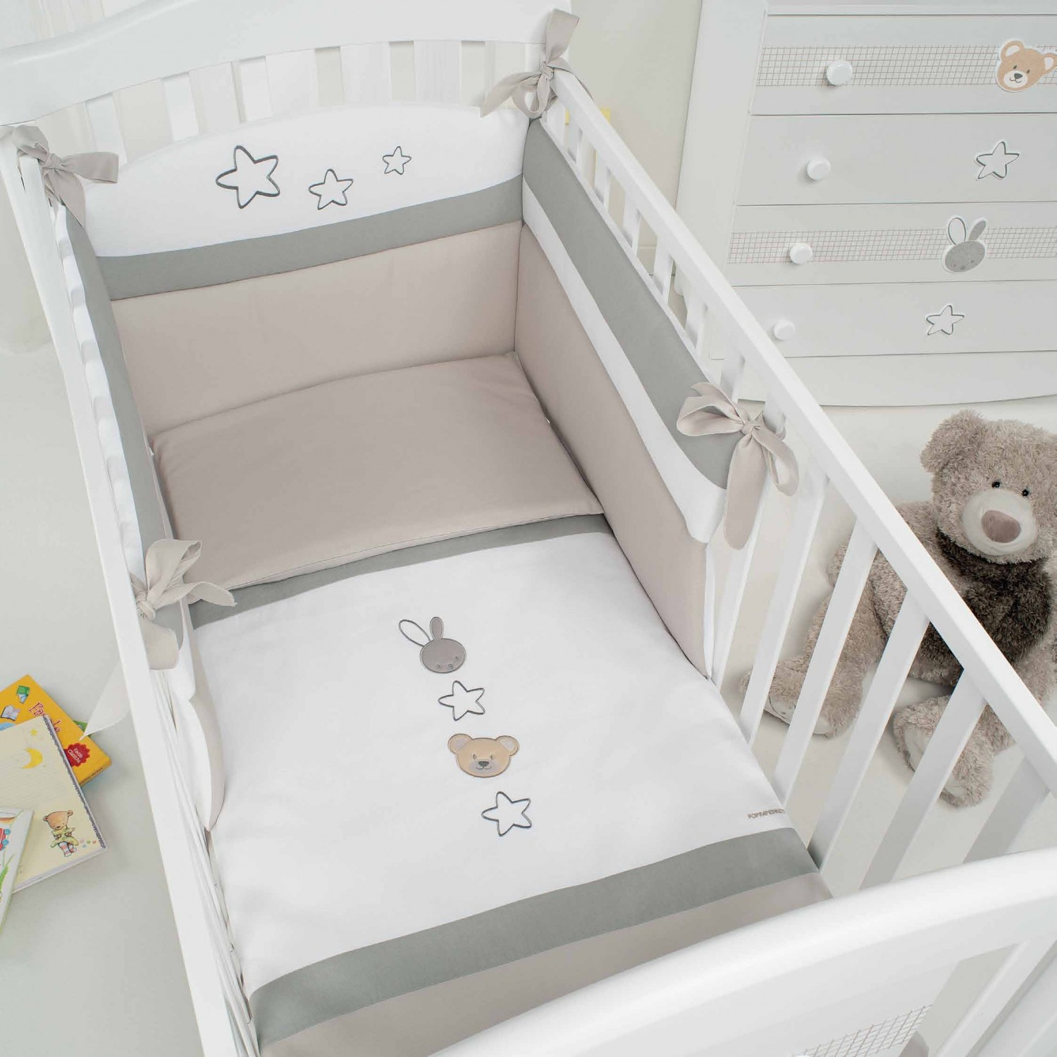 Juego de edredón compuesto por: bumper, bolsa extraíble, acolchado y funda de almohada.