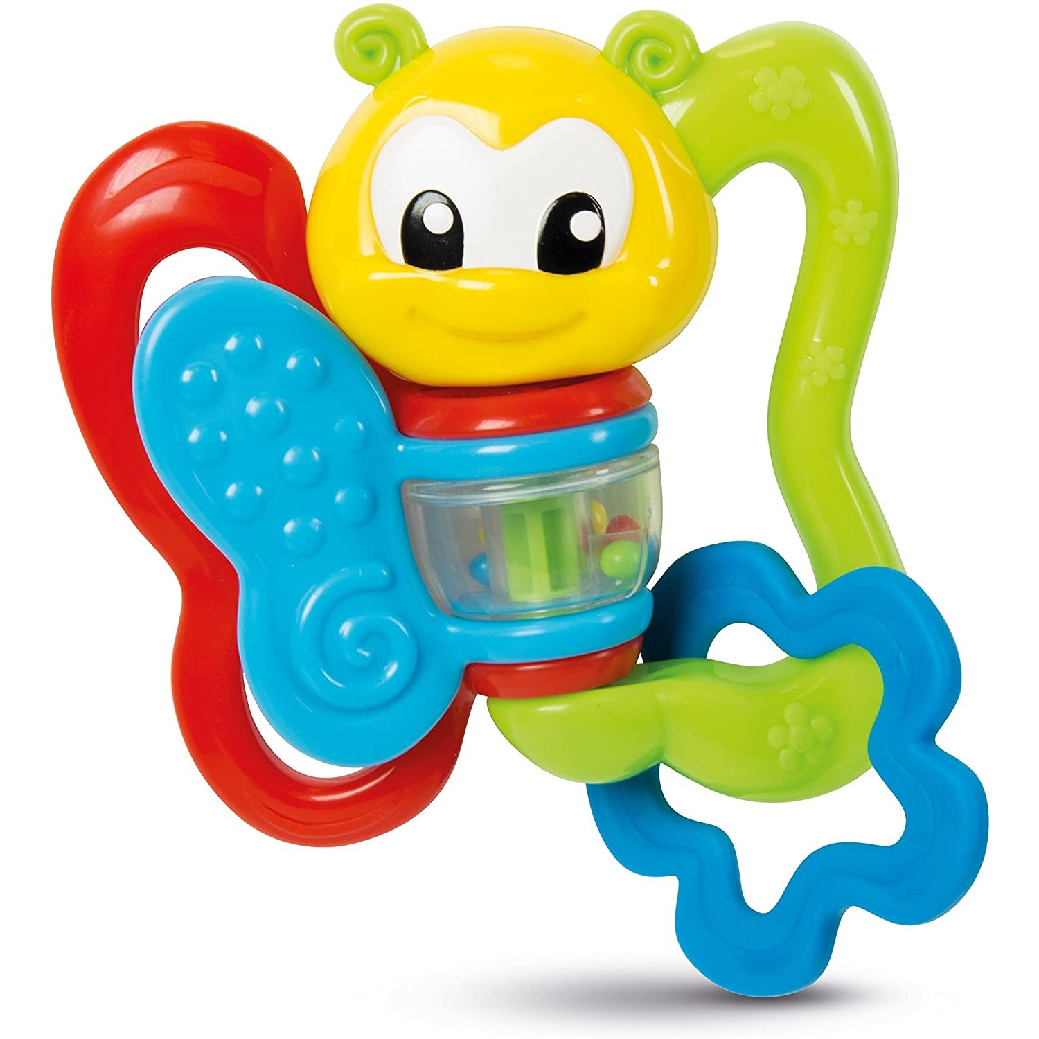 ¡Un colorido sonajero en forma de mariposa con muchas actividades mecánicas diseñadas específicamente para los más pequeños! Las alas de colores actúan como un asa, la solapa azul se mueve hacia adelante y hacia atrás y las bonitas bolas en la barriga estimulan la percepción visual-auditiva y la destreza del niño. El colgante de plástico suave y masticable es ideal para la fase de dentición. Edad recomendada: + 3 meses.