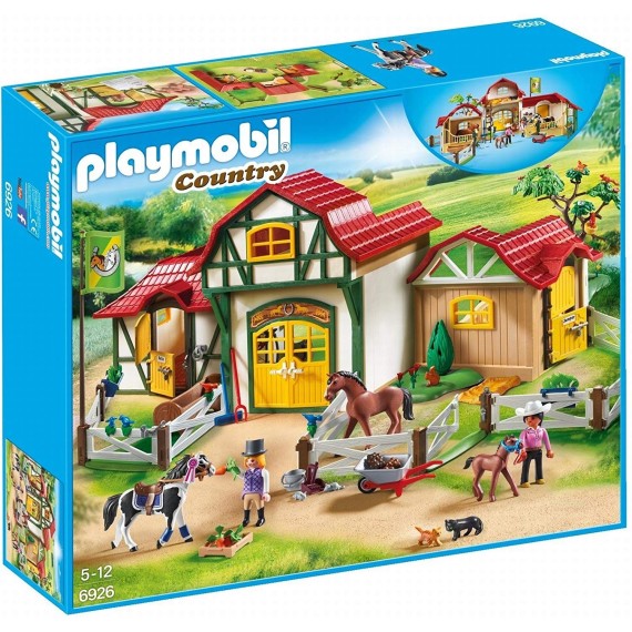 Granja de caballos que dispone de un cercado con entrada principal y dos espaciosos establos a cada lado. En la parte superior de la granja encontrarás un granero donde guardar el alimento de los animales. También hay una estantería donde podrás colocar todos los utensilios de monta y cuidado de los caballos. Incluye 2 figuras Playmobil, 3 caballos, pequeños animales y una larga lista de accesorios. Recomendado a partir de 4 años. Advertencia de Seguridad: Este producto no se recomienda para menos de 3 años, ya que tiene piezas pequeñas que podrían ser ingeridas por el niño/a.Pesos y medidas:- Peso: 2,38