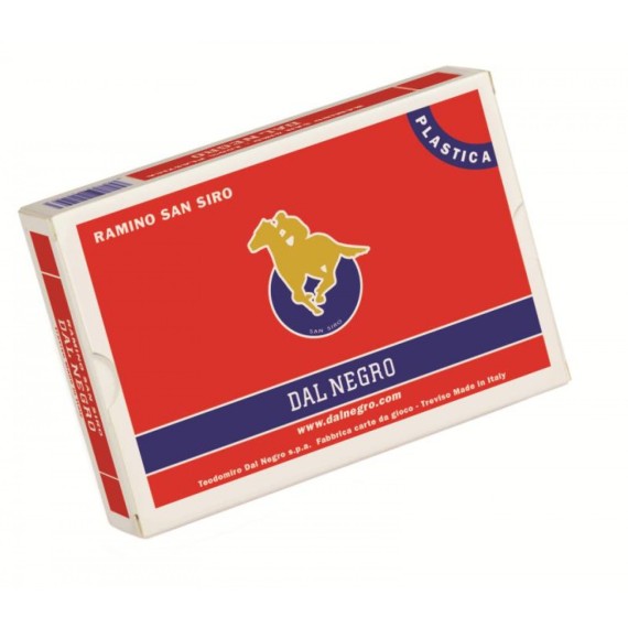 Estuche con dos barajas de cartas 100% Plástico, fondo rojo San Siro / azul. Tamaño de póquer 63x88 mm. Número de cartas 55 + 55.