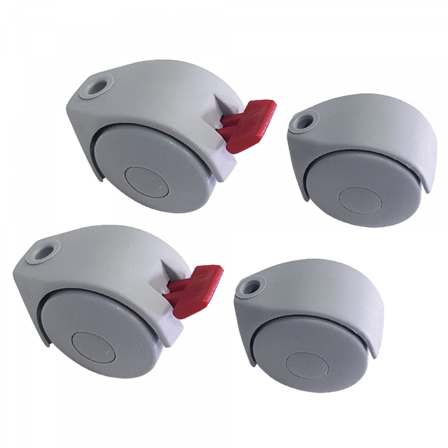 Juego de ruedas para cajonera Asia, útil como reemplazo de tus ruedas rotas desgastadas. El kit está equipado con 4 ruedas, dos de las cuales son normales y dos con freno y el kit de tornillería para montarlas.